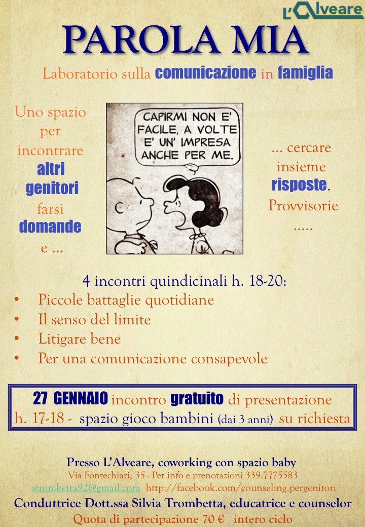 Alcuni degli ultimi laboratori educativi da me condotti: gruppi di genitori che condividono le loro esperienze e dubbi sul tema scelto e, con la mia conduzione, sperimentano nuovi modi di affrontare le situazioni.